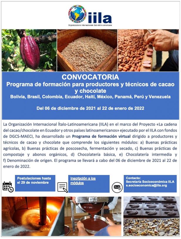 IILA, a través de la Secretaría Socioeconómica, organiza un taller integral de capacitación virtual sobre cacao y chocolate que prevé 6 módulos de formación impartidos por un equipo de reconocidos expertos internacionales. El programa tiene como objetivo fortalecer los conocimientos y habilidades de los productores y técnicos latinoamericanos en el cultivo de cacao y en la producción de chocolate de alta calidad, que permita mejorar la competitividad en los mercados locales e internacionales, generando mayores oportunidades económicas para sus familias y por lo tanto una mejor calidad de vida. El programa se realiza gracias a los fondos puestos a disposición por la DGCS-MAECI.