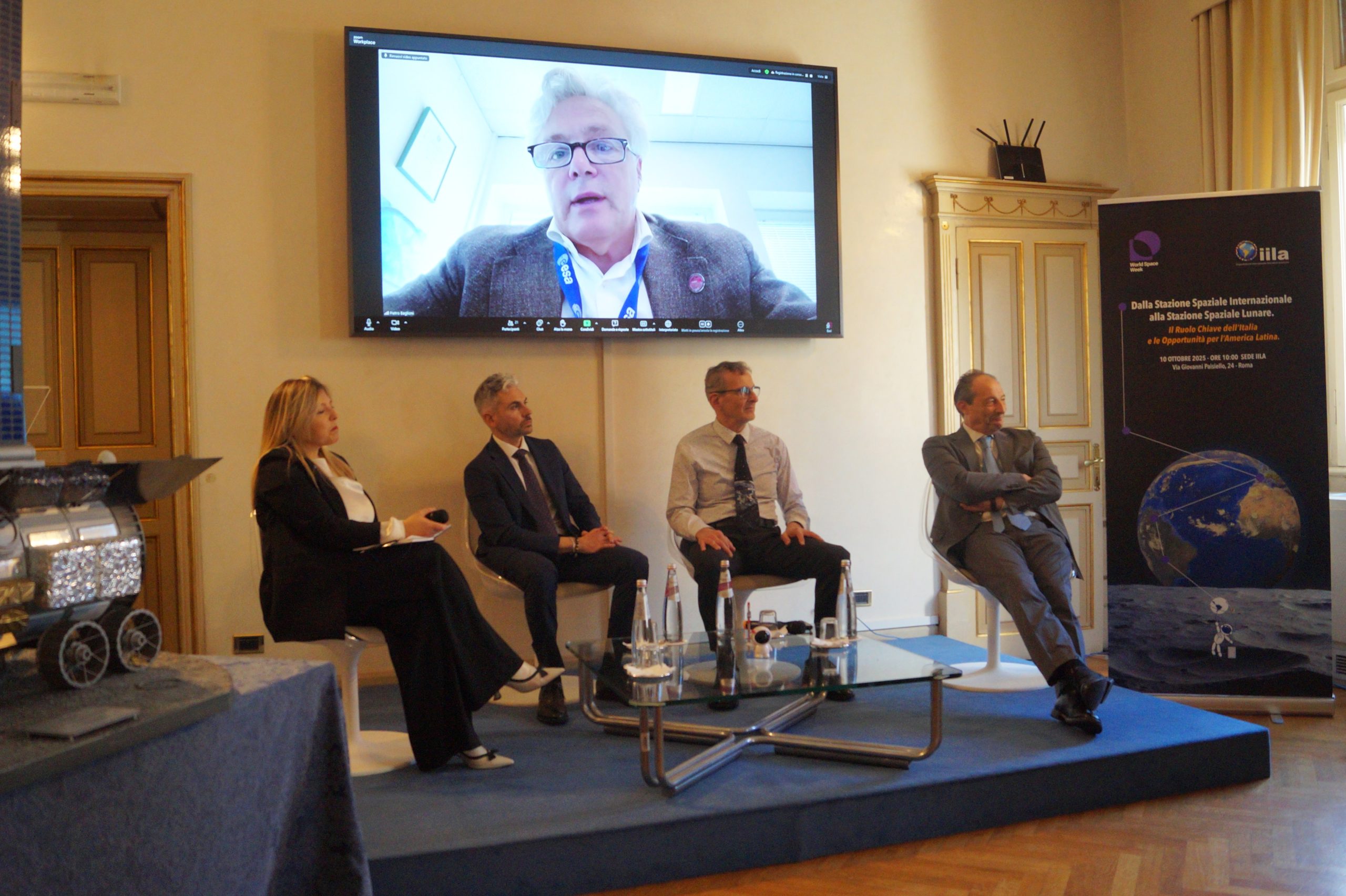 El encuentro se articuló en dos paneles temáticos. El primero, titulado “La historia de los hábitats espaciales: aspectos técnicos, jurídicos y de gobernanza”, moderado por la Secretaria Técnico-Científica de la IILA, Tatiana Ribeiro Viana, contó con las intervenciones de: Walter Cugno (Thales Alenia Space); Valentina Sumini (Politécnico de Turín, MIT); Gabriella Arrigo (ASI); Sergio Marchisio (ESA-ECSL); Giuseppe Reibaldi (Moon Village Association). En el segundo panel, “La contribución italiana en la exploración espacial. Alianzas y oportunidades para América Latina”, moderado por la Vice Directora de la Oficina de Cooperación Internacional y Diplomacia Espacial, Maria Chiara Noto (ASI), participaron: Mario Cosmo (ASI); Pietro Baglioni (ESA); Nicola Pizzolorusso (Telespazio); Ricardo Yague (Thales Alenia Space).