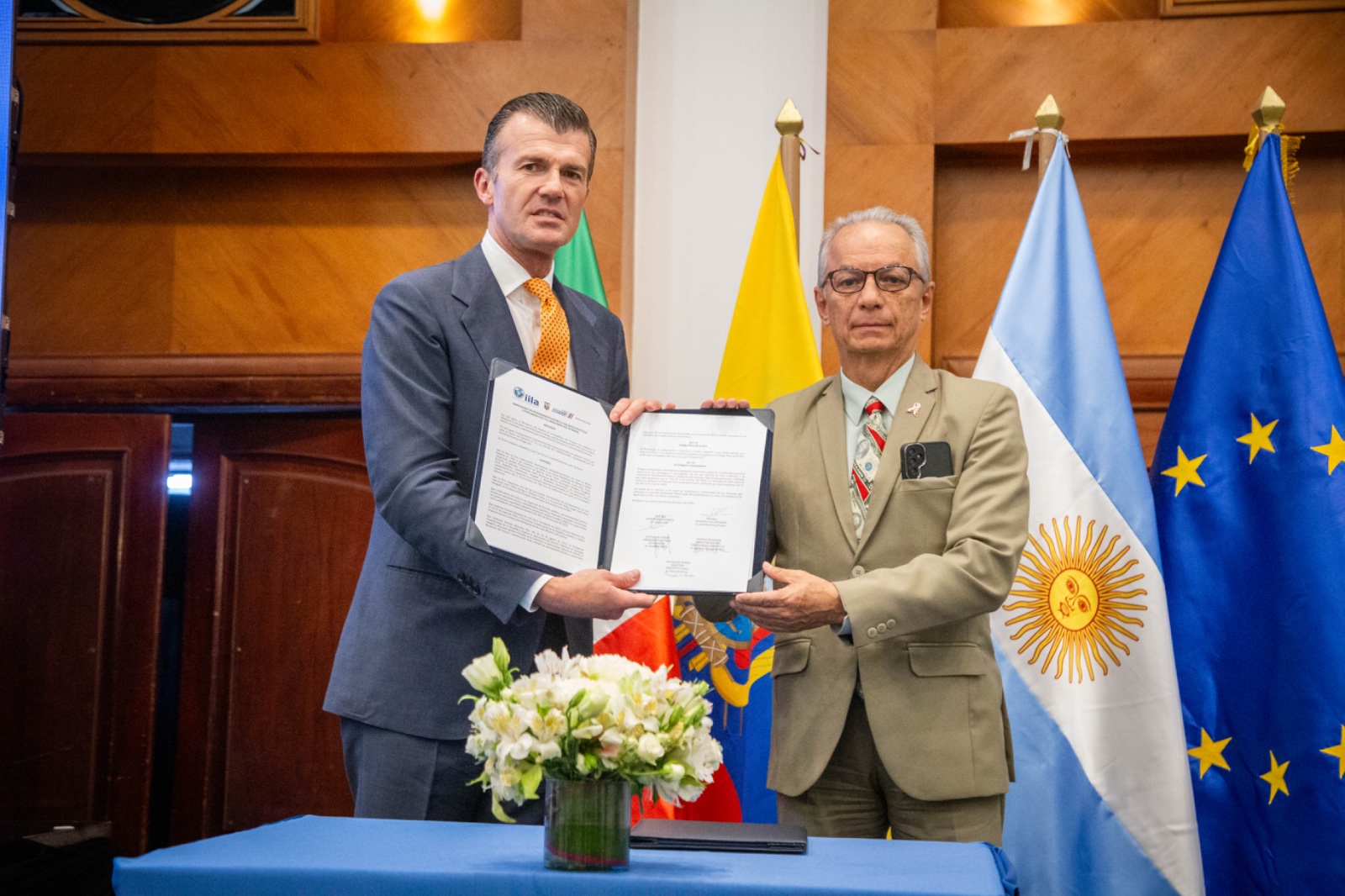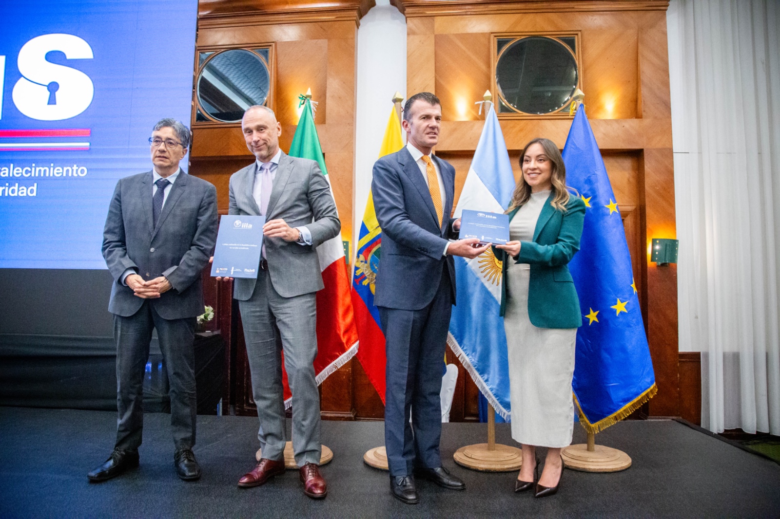 Durante la giornata conclusiva è stato firmato il Memorandum of Understanding tra l’IILA e il Ministero dell’Interno dell’Ecuador, avviando una nuova fase di collaborazione stabile in giustizia e sicurezza, con priorità operative precise. Nel suo intervento, il Segretario Generale Silli ha ricordato che l’IILA esegue programmi di cooperazione giudiziaria finanziati sia dal Ministero degli Affari Esteri e della Cooperazione Internazionale italiano sia dall’Unione Europea, come SERPAZ (Sicurezza, Speranza e Resilienza per la Pace in Ecuador) e ITAJUS, che hanno reso possibile questo primo Foro internazionale. “Eventi come questo – ha sottolineato SG Silli – rappresentano il cuore dell’impegno congiunto di Italia, Europa e Paesi dell’America Latina per contrastare la penetrazione criminale che mina lo Stato di diritto e inquina l’economia”. Alla cerimonia di firma del MoU hanno partecipato come testimoni d’onore: S.E. Giovanni Davoli, Ambasciatore d’Italia in Ecuador; il Magistrato Paolo Di Sciuva, Direttore Internazionale del Progetto ITAJUS e del Componente 2 del Programma SERPAZ; il Magistrato Giovanni Tartaglia Polcini, Deputy Director del programma EL PACCTO 2.0. Al termine della cerimonia di firma dell’accordo, il Segretario Silli ha consegnato alla Vicepresidenta dell’Asamblea Nacional dell’Ecuador, Mishel Mancheno, e al Presidente della Corte Nacional de Justicia, Marco Rodríguez, una versione in spagnolo del Codice Antimafia della Repubblica Italiana, un gesto simbolico che promuove dialogo, conoscenza condivisa e visione comune.