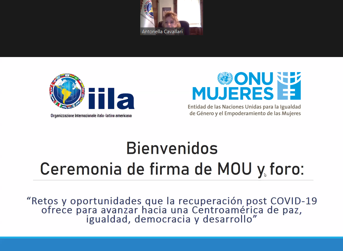 Così, la Segretario Generale IILA, Antonella Cavallari, ha aperto i lavori del Forum virtuale “Sfide e opportunità offerte dalla ripresa post covid-19 per avanzare verso un centroamerica di pace, uguaglianza, democrazia e sviluppo”, organizzato da IILA e Onu Mujeres (Entità delle Nazioni Unite per l’uguaglianza di genere e l’empowerment femminile), il 4 novembre 2021. Un’ occasione di dialogo tra Italia e America latina per riflettere sulle politiche pubbliche legate ai Sistemi di assistenza e cura come asse della ripresa post-COVID 19 e sulle possibili strategie per la ripartenza, in particolare nei paesi centroamericani, contribuendo al rafforzamento della pace, dell’uguaglianza, della democrazia e dello sviluppo nella regione.